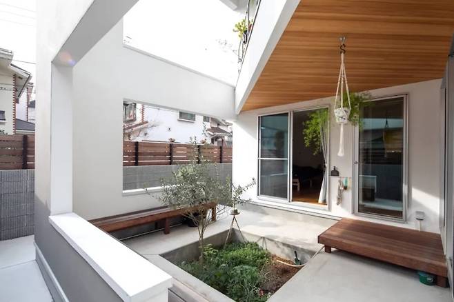 이 집은 건물의 구조 자체가 독특합니다. L자 형태의 건물이 정원을 에워싸고 있으며, 그 중심에는 햇살이 가득한 야외 공간이 마련되어 있습니다.