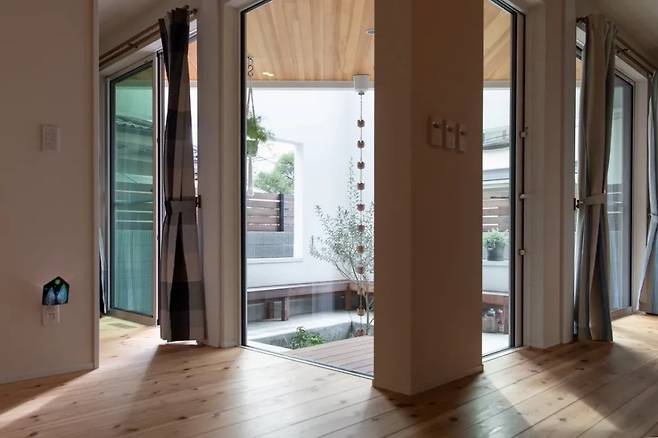 기둥과 보가 정원까지 이어져 있어 내부와 외부가 자연스럽게 연결됩니다. 커튼을 닫지 않아도 프라이버시를 유지할 수 있는 구조입니다.