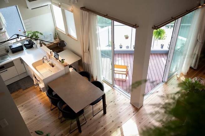 2층에는 전형적인 LDK 구성 대신, 거실과 식당, 주방, 테라스를 아우르는 독특한 LDKT 구조로 설계되었습니다.