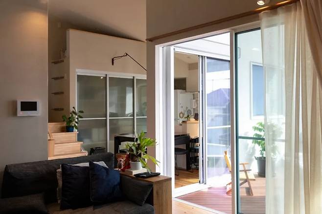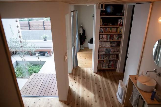 현관문을 열자마자 펼쳐지는 것은 다름 아닌 넓은 정원입니다. 좁은 공간에서도 이 정원은 시선을 사로잡으며 집의 중심 역할을 합니다.
