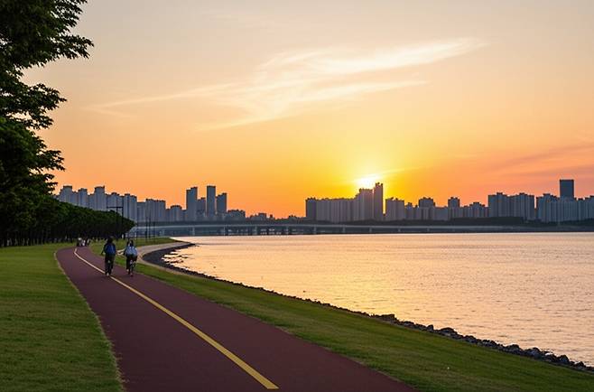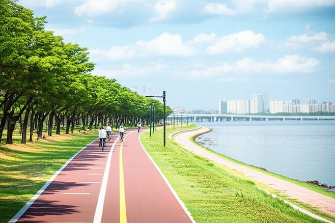 A: 아침이나 저녁 시간대가 비교적 시원하고 한적하여 자전거를 타기 좋습니다. 특히, 해질녘 노을을 감상하며 타는 라이딩은 매우 아름답습니다.