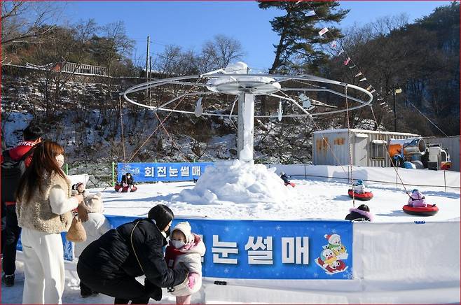 축제의 중심은 단연 눈썰매장입니다. 약 120m 길이의 튜브 눈썰매장은 수도권에서도 손꼽히는 규모로, 아이뿐 아니라 어른도 충분히 속도감을 느낄 수 있습니다. 썰매를 타고 내려오는 동안 펼쳐지는 계곡과 산 풍경은 도심에서는 쉽게 경험하기 어려운 겨울 장면을 만들어 줍니다.