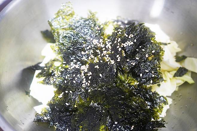 저는 김가루를 사용하거나, 일반 조미김을 부숴서 넣어도 좋다는 팁을 얻었어요. 김의 고소함과 짭조름한 맛이 양배추와 정말 잘 어울리더라고요.
