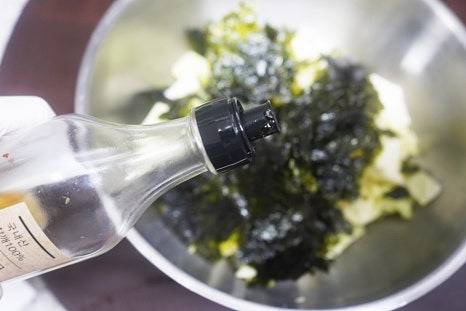 조미김이 부서지면서 그 감칠맛이 폭발해요. 양념을 너무 세게 무치지 않도록 주의하세요.