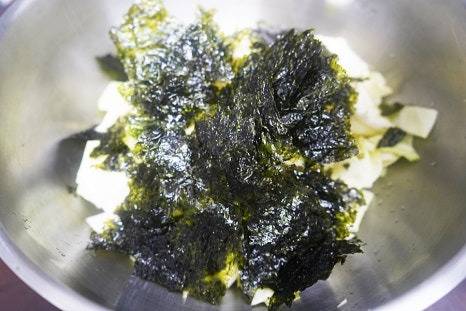 채 썬 양배추를 큰 볼에 넣고, 양념 재료들을 넣은 뒤, 조미김을 넣고 살살 무쳐줍니다.