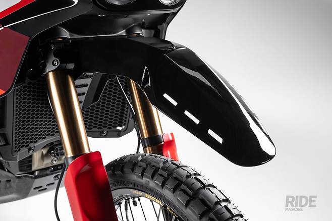 기존 데저트X도 오프로드에서 뛰어난 주파성을 보여주는 모델이었지만, 이번 랠리는 더욱 극한의 오프로드를 위해 설계됐다. 우선 최저지상고를 기본형 대비 30mm 높인 280mm로 설정했다. 또한 오프로드 주행에서 중요한 역할을 하는 요소 중 하나인 서스펜션의 경우, 앞에 폐쇄형 카트리지 포크를 적용한 KYB 서스펜션과 피스톤을 확대한 쇼크 업소버를 적용했다. 이는 엔듀로보다 더 높은 서스펜션 성능을 요구하는 모토크로스에서 유래된 것으로, 덕분에 험지에서 장애물을 더욱 수월하게 극복할 수 있도록 도와준다. 특히 KYB의 폐쇄형 카트리지의 경우, 일정 이상의 속도로 서스펜션이 작동할 경우 내부 오일에 녹아있는 공기방울이 결합해 피스톤 후방에 공동(空洞)을 형성하는 ‘캐비테이션(Cavitation)’을 억제하기 위한 것이어서 일정 이상의 속도로 오프로드를 달려야 하는 모델에게는 필수적인 선택이라 해도 과언이 아니다. 또한 여기에 작동에서의 부드러움과 내마모성 향상을 위해 특수 코팅 처리를 더했다.