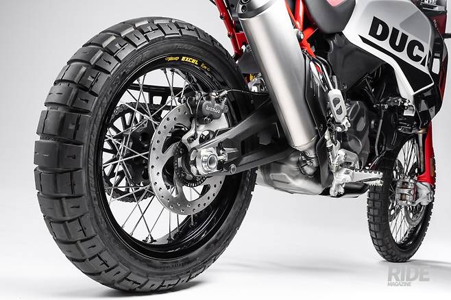 오프로드에서는 스포크 휠의 역할도 중요한데, 견고한 탄소강 스포크와 타카사고 엑셀 림으로 구성된 휠이 장착됐다. 타이어는 피렐리 스콜피온 랠리 STR이 기본 사양으로 적용되며, 오프로드에서의 주파성 향상을 위해 스콜피온 랠리를 선택하거나 일반 도로 주행을 고려해 스콜피온 트레일 II를 선택할 수도 있다. 험지 주파 시 바퀴로부터 전해지는 충격에도 주향이 흐트러지지 않도록 올린즈 스티어링 댐퍼가 장착됐다.