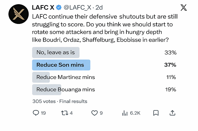 LAFC 팬 계정이 진행한 공격진 운영 투표에서 손흥민의 출전 시간을 줄이자는 선택이 36.7%로 1위를 기록했다.