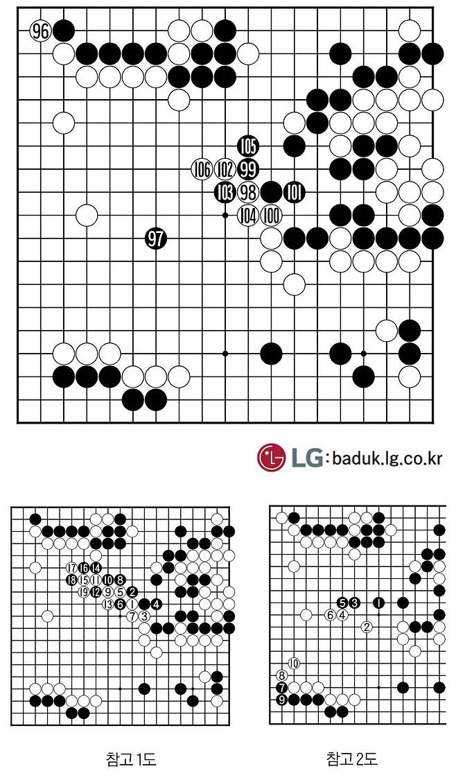 <제11보>(96~106)=96은 침착하다. 일단 집으로 큰 귀를 차지하며 천천히 가겠다는 뜻이다. 잠깐 참고 1도를 보자. 1 이하 19까지의 수순은 좌반부 일대를 키우는 그럴싸한 그림이다. 언뜻 보기에 화려한 것 같은 이 진행은 단점이 많아서 겁도 나는 게 사실. 결행하기가 좀처럼 쉽지 않다.