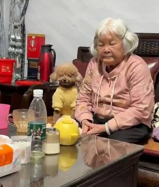 강아지는 두 발로 서서 마치 사람처럼 앉아 있었고, 살짝 감긴 눈과 벌린 입, 그리고 고개가 꺾인 모습까지 할머니와 완벽한 데칼코마니를 이루고 있었습니다.
