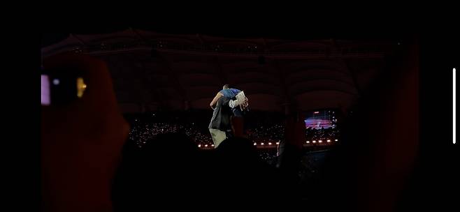 무대로 불러올려져 캡틴과 포옹하는 이 관객분은
