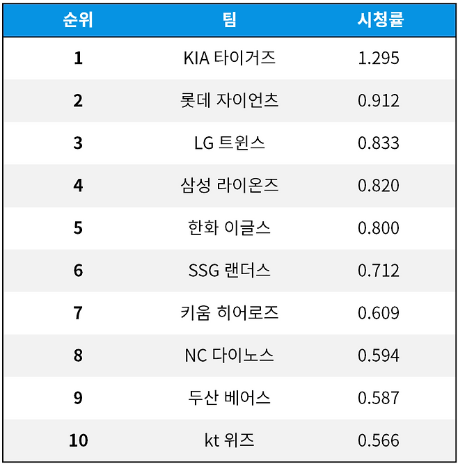 2022시즌 KBO리그 구단별 시청률