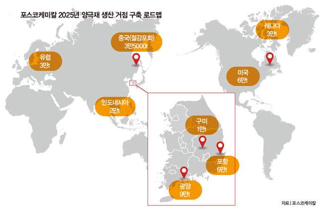 포스코케미칼은 양극재 생산량 확대를 위해 선제적인 투자에 나섰다. 11월 10일 포스코케미칼은 전남 광양에 연산 9만t 규모의 양극재 공장을 4년 3개월 만에 완공하며 기존 연간 3만t의 생산능력을 3배 이상으로 끌어올렸다. 이는 고성능 전기차 약 100만 대분의 배터리를 만들 수 있는 양으로, 단일 공장 기준 세계 최대 생산능력이다. 민경준 사장은 광양 공장 준공식에서 "세계 최대 규모, 최고 수준 기술을 갖춘 생산기지를 구축해 급성장하는 시장 수요에 대응하는 기반을 마련했다"며 "이를 바탕으로 글로벌 투자 속도를 더욱 높이고 성장동력을 지속적으로 확보해나갈 것"이라고 밝혔다. 이에 따라 포스코케미칼은 북미·유럽·중국 등 글로벌 거점 확장에 속도를 내고 있다. 5월 미국 완성차업체 제너럴모터스(GM)와 북미 양극재 합작사 얼티엄캠(Ultium CAM)을 출범하고, 8월 캐나다 퀘벡에 연산 3만t 규모의 양극재 공장 착공에 들어갔다. 이 공장은 2024년 하반기 완공될 예정이며, 추후 GM의 전기차 사업 확대에 따라 단계적 증설을 추진할 계획이다.