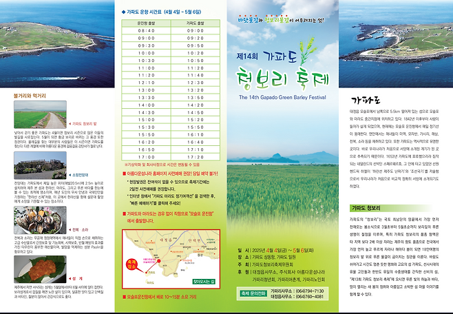 2025년 4월 4일부터 5월 6일까지 열리는 <제14회 가파도청보리축제>는 18만여 평에 달하는 청보리밭이 장관을 이루는 제주 대표 봄 축제다.