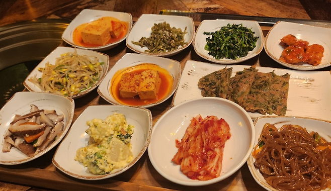구성: 제육볶음 + 밥(놋그릇) + 계란찜 + 된장찌개 + 잡채, 나물, 두부조림 등 반찬 약 7~8가지