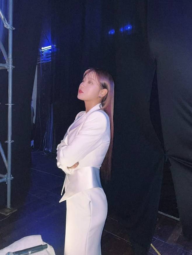 과거 무대 의상과 비교했을 때, 컬러는 맞춘 셋업 스타일을 유지하면서도 상의는 최대한 오픈된 스타일링을 통해 가녀림을 강조하는 것이 특징입니다.