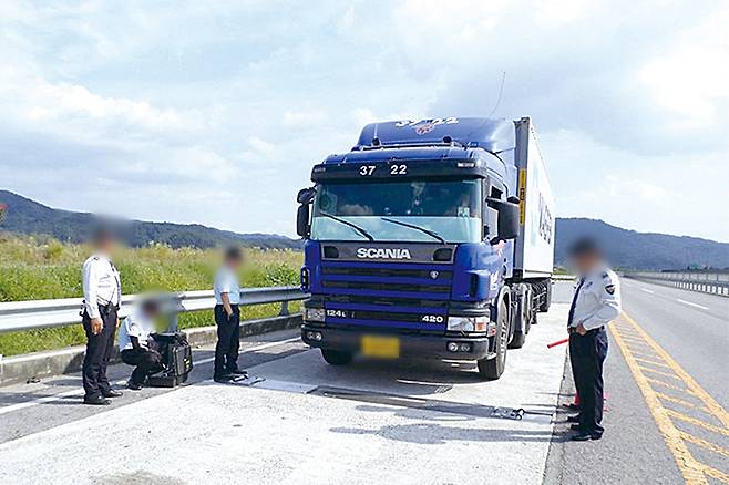 단속 시작 5분 만에 첫 위반 차량이 적발됐다. 25t 화물차 운전자가 안전띠를 착용하지 않은 채 운전하다가 범칙금 처분을 받았다. 일부 운전자들은 “상·하차 반복으로 안전띠 착용이 번거롭다”라고 해명했지만 경찰은 생명 띠 착용의 중요성을 재차 강조했다. 이어 전방 유리에 불법 반사필름을 부착한 차량이 적발돼 현장에서 바로 제거 지시를 받았다.