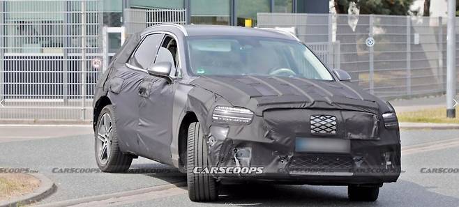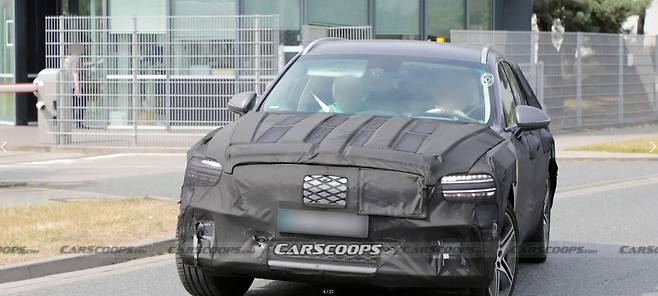 비록 두꺼운 위장막 속에 가려진 새로운 GV70 일렉트리파이어의 모습을 완전히 확인하기는 어렵지만 위장막 사이로 보이는 모습은 올해 상반기 출시한 제네시스 GV70 페이스리프트 디자인과 유사한 모습을 갖추고 있음을 짐작할 수 있겠는데 기존 두 줄 헤드램프 디자인은 첨단 기술력이 결합된 MLA 타입 헤드램프가 적용되어 있었고 전면부 라디에이터 그릴은 G-MATRIX 패턴 드릴 디자인이 적용되었고 기존과 동일하게 막혀 있는 디자인과 더불어 오른편에는 전기차 충전구가 자리잡아 있는데 해당 전기차 충전구의 경우 야간에도 편리하게 충전할 수 있도록 LED가 적용될 것으로 알려져 있으며 그 외 범퍼 하단 디자인은 기존 사다리꼴 형태에서 축소된 형상의 디자인이 적용되었고 양 측에는 주행 및 주차 관련 센서들이 자리잡고 있습니다.