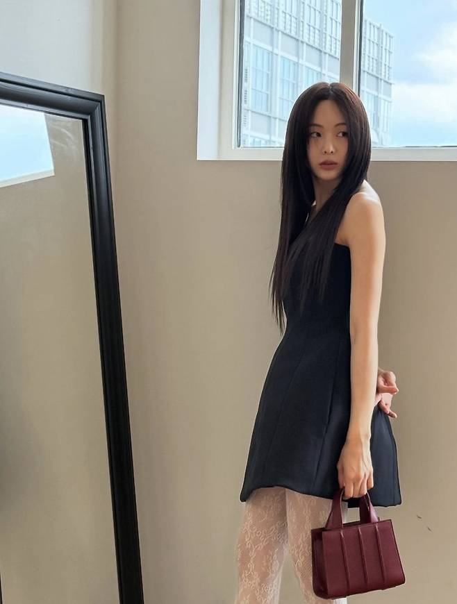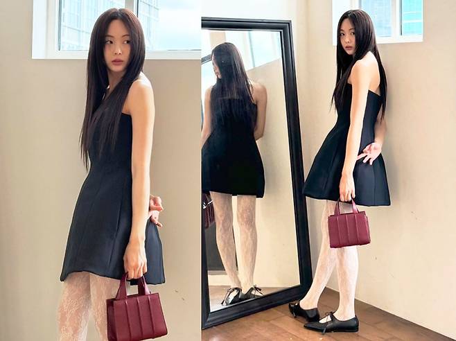 금새록은 심플하면서도 세련된 블랙 튜브탑 미니 드레스에 화이트 레이스 타이즈를 매치해 고급스럽고 독창적인 룩을 완성했습니다.