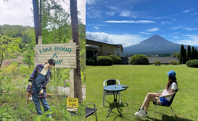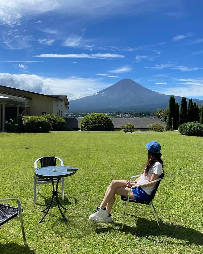 히라이 사야는 후지산이 보이는 넓은 잔디밭에서 편안한 여름 캐주얼 룩을 연출하고 있다. 화이트 티셔츠에 블루 반바지를 매치한 심플한 조합으로 청량감을 강조했으며, 블루 베레모를 포인트 아이템으로 활용해 프렌치 시크한 분위기를 더했다. 화이트 스니커즈로 마무리한 전체적인 룩은 자연스러우면서도 세련된 여름 피크닉 스타일을 완성하고 있다.