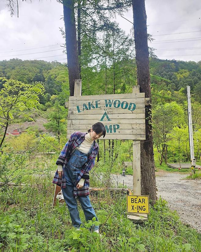레이크 우드 캠프에서는 체크 패턴 셔츠와 데님 오버올을 조합한 빈티지 캠핑 룩을 선보이고 있다. 레드와 블루가 믹스된 체크 셔츠를 데님 오버올 안에 레이어링하여 캐주얼하면서도 실용적인 아웃도어 스타일을 연출했다. 화이트 스니커즈로 마무리한 이 룩은 자연 속에서의 액티비티에 최적화된 편안한 스타일링을 보여주고 있다.