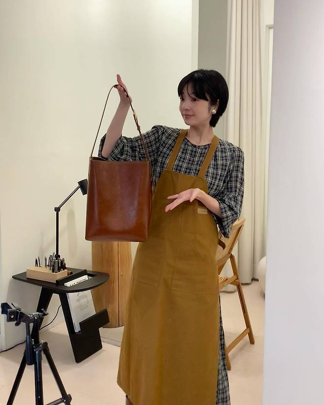 가죽 공예 작업 중에는 체크 셔츠와 옐로우 에이프런을 매치한 실용적인 작업복 스타일을 선보이고 있다. 그레이 체크 셔츠 위에 착용한 옐로우 컬러의 가죽 에이프런이 작업복의 기능성과 스타일을 동시에 만족시키며, 전문적인 수공예 작업자의 세련된 작업복 스타일을 연출하고 있다.