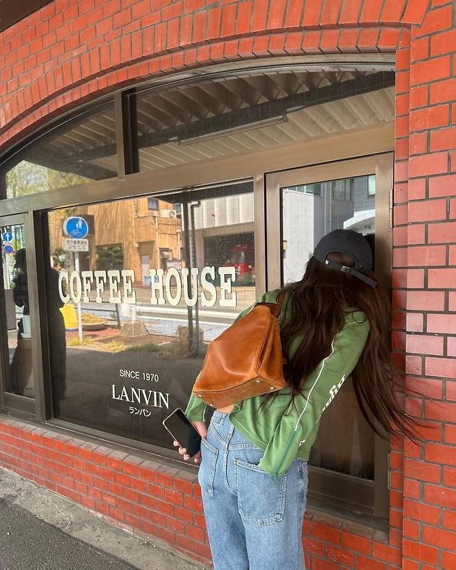 낮 시간대 카페 앞에서는 보다 캐주얼한 느낌의 착장을 선보였다. 그린 컬러의 슬리브 티셔츠에 같은 데님 팬츠를 매치하고, 여전히 같은 레더 숄더백을 가볍게 걸쳤다. 모자는 그대로, 헤어는 자연스럽게 풀어내려 편안한 여행자 무드를 풍겼다. 그녀는 카페 창문을 들여다보는 장난스러운 모습으로 사랑스러운 에너지를 더했다.