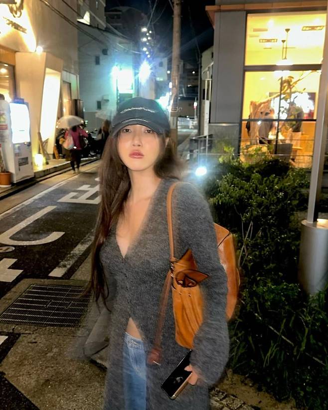 밤 거리에서 포착된 화사는 짙은 그레이 롱 니트 가디건을 깊게 여며 착용해 묘한 시스루 무드를 연출했다. 이너 없이 과감하게 스타일링한 듯한 착장은 그 자체로 시선을 사로잡았다. 여기에 라이트 워시드 데님 팬츠와 블랙 볼캡을 더해 내추럴하면서도 시크한 분위기를 완성했다. 이때 숄더에 툭 걸쳐 든 브라운 레더백은 단조로운 톤온톤 룩에 확실한 포인트가 되어 주었다.