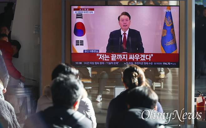 | ▲ 12일 오전 윤석열 대통령이 지난 3일 저녁 비상계엄 선포 관련 대국민담화를 발표하는 가운데, 서울역 대합실에서 시민들이 생중계를 시청하고 있다. |