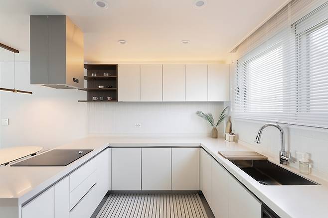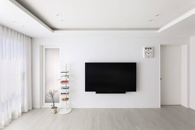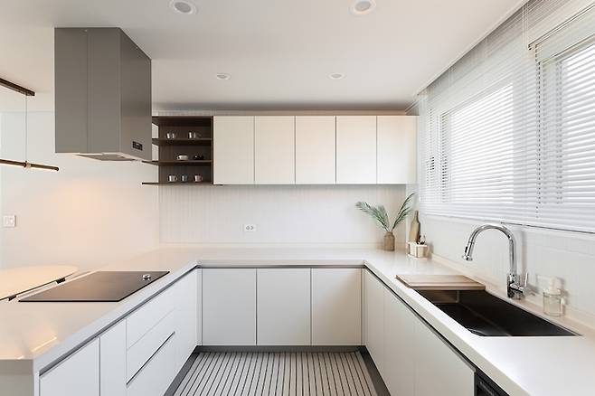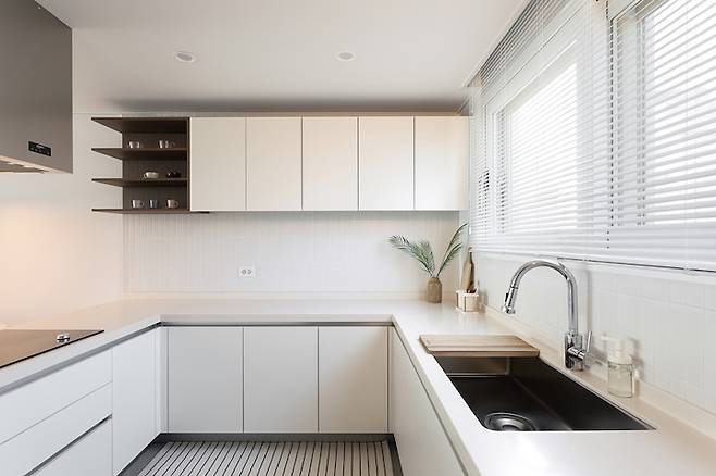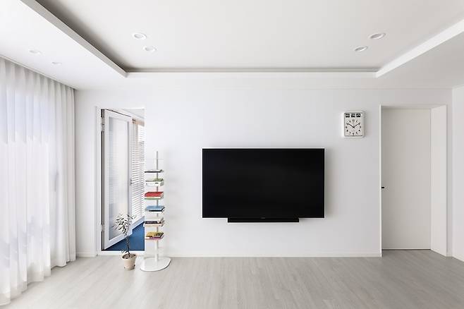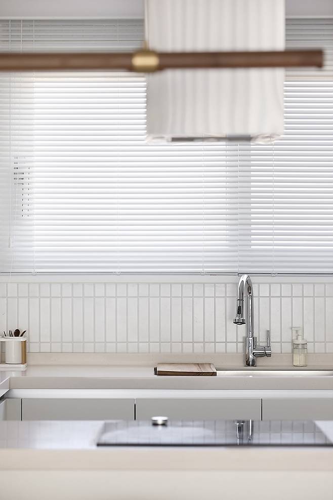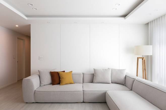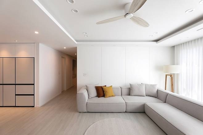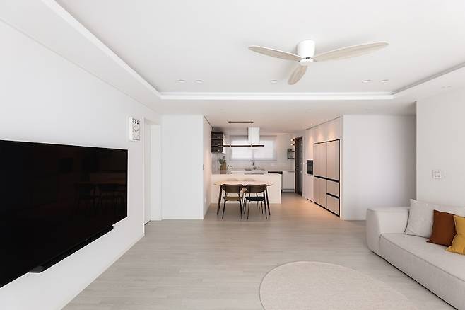 화이트 톤의 모던한 거실과 이어지는 주방에서는 월넛으로 포인트된 심플한 거실 연출 9mm문선 제작으로 심플한 디자인 연출 실링팬과 소파의 컬러를 따듯한 오트밀 컬러로 톤앤무드 하였습니다.