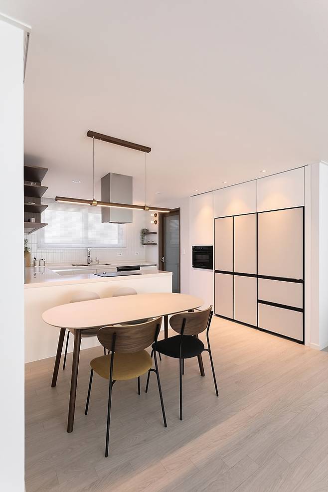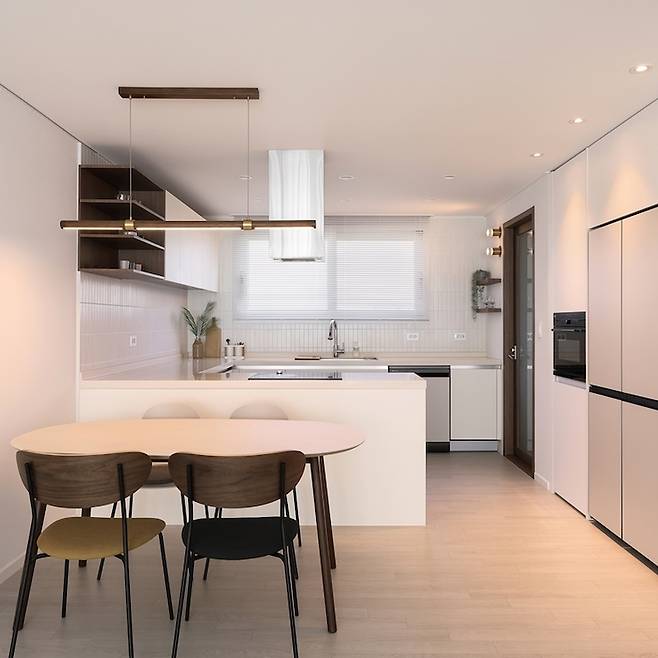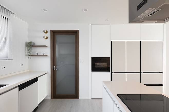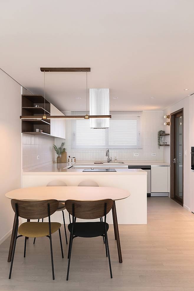 화이트톤의 심플한 주방에 월넛으로 포인트 된 주방 무지주 선반과 귀여운 벽등으로 러블리한 공간이 탄생하였습니다. 냉장고와 김치냉장고는 비스포크로 제작 가구와 함께 맞추었습니다.