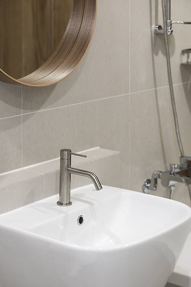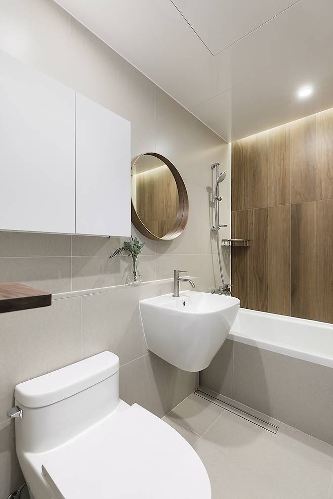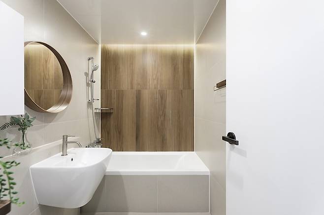 오트밀 컬어에 우드로 포인트된 욕실은 가족욕실로 따듯한 느낌 연출 하였고 천정에 간접 조명을 활용하여 은은한 무드를 살렸습니다.