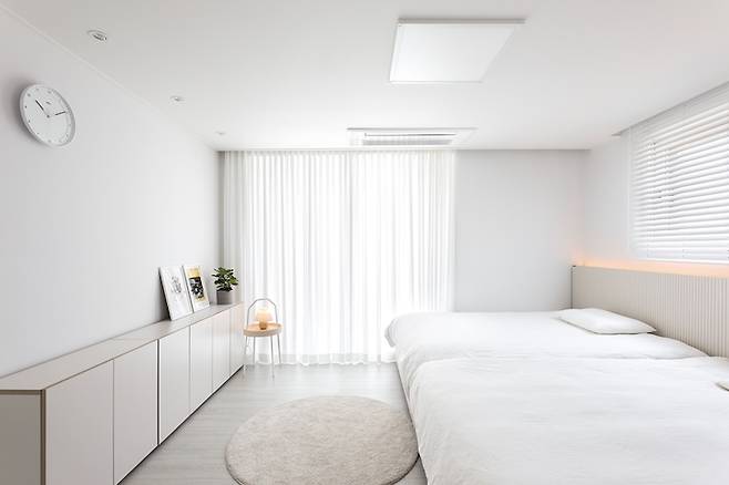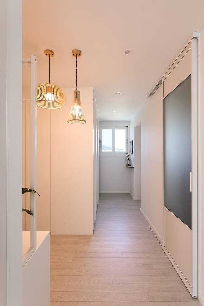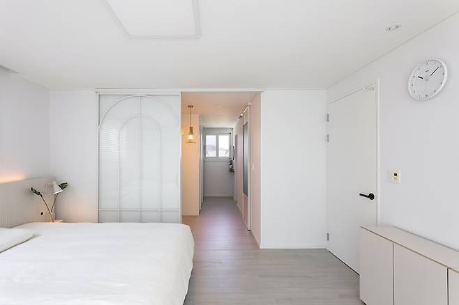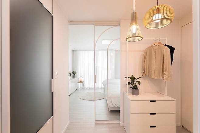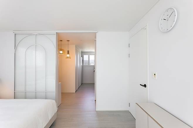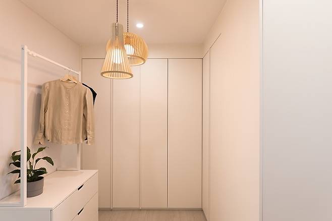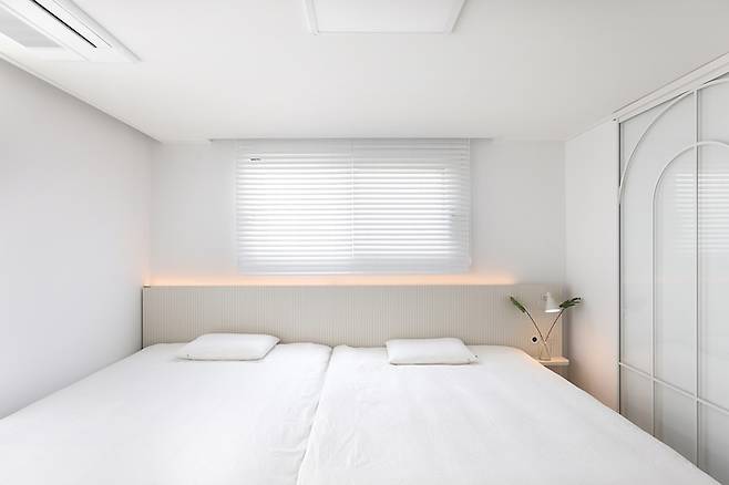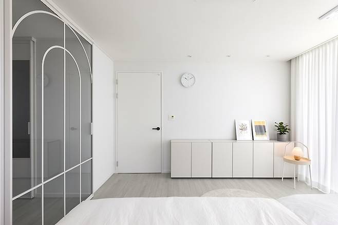 부부침실은 침대헤드를 제작하여 무드를 조성하고, 드레스룸도어를 디자인 중문으로 제작하여 개방감과 디자인 모두를 잡았습니다. 또한 드레스룸에 리조트를 연상 시키는 우드 조명을 설치하여 구석구석 아늑한 분위기를 연출하였습니다.