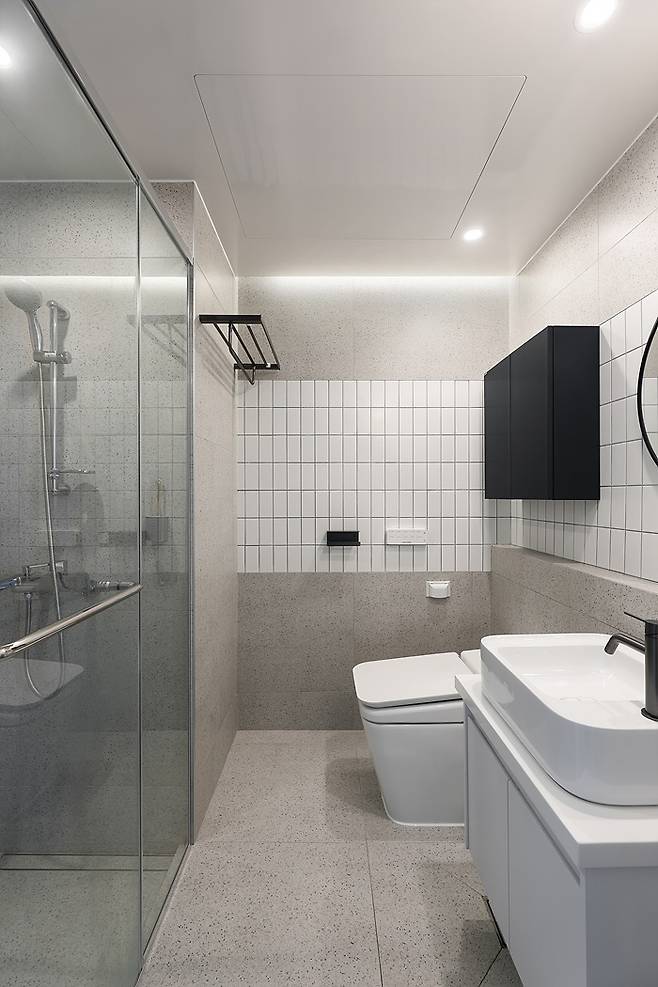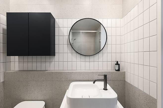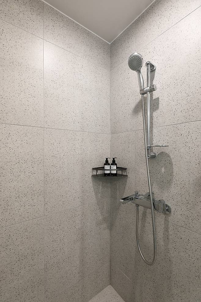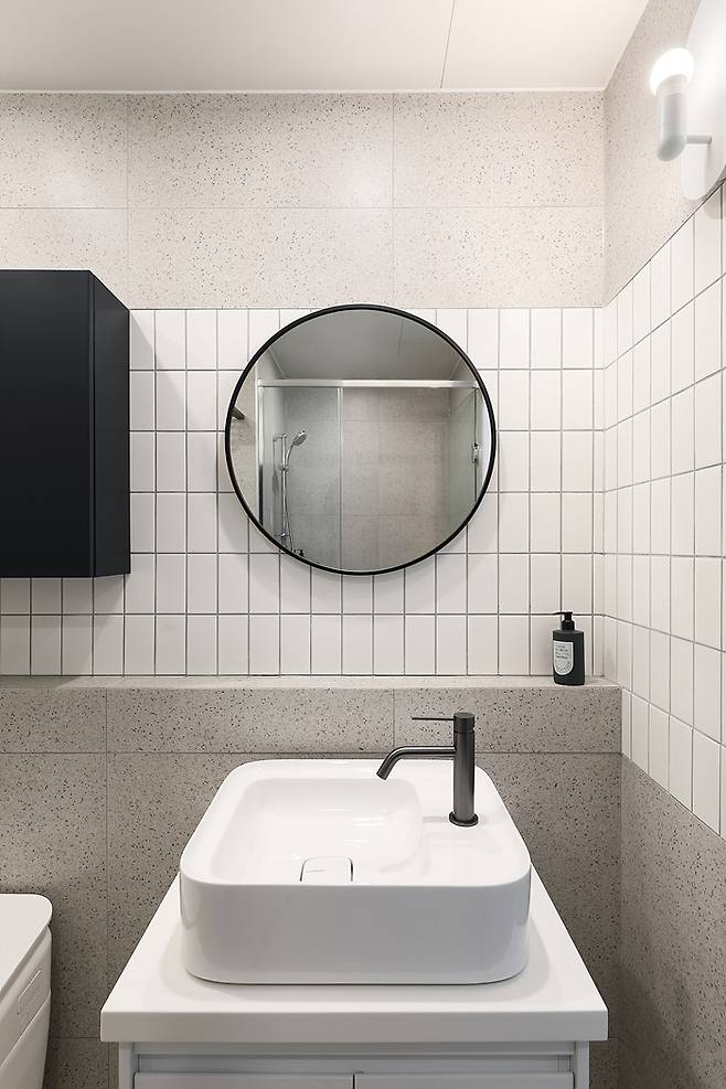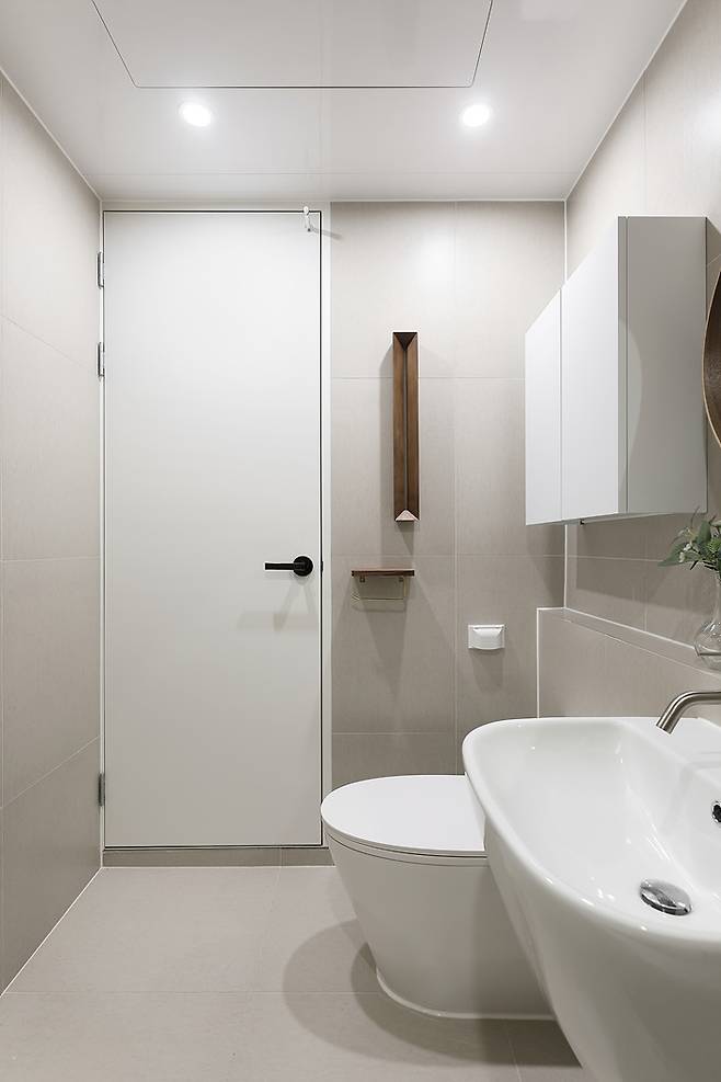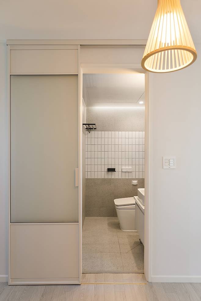 안방욕실은 도어를 슬라이딩으로 제작하여 공간활용에 중점을 두었고, 건식으로 사용될 수 있도록 부스를 제작하였습니다. 안방 욕실도 거실 욕실과 마찬가지로 천정에 간접 조명을 설치하여 은은한 무드를 느낄 수 있도록 했습니다.