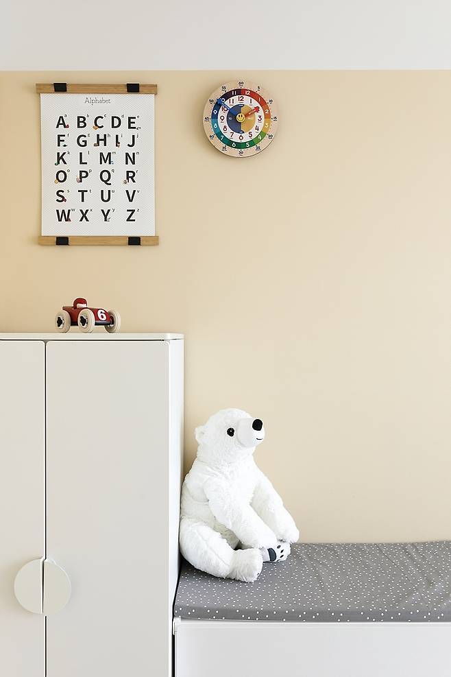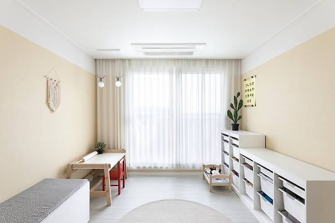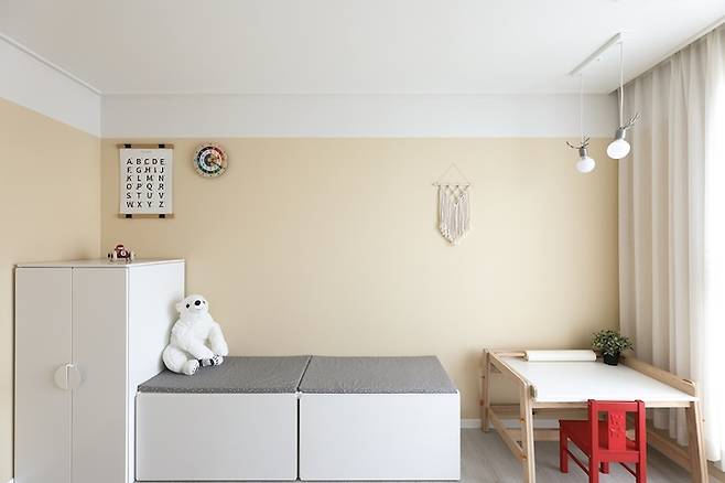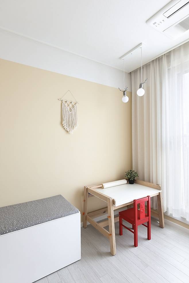 따뜻한 노란색 컬러로 투톤 도배된 아이방은 아기자기한 조명과 가구 홈스타일링으로 포인트 하였습니다.