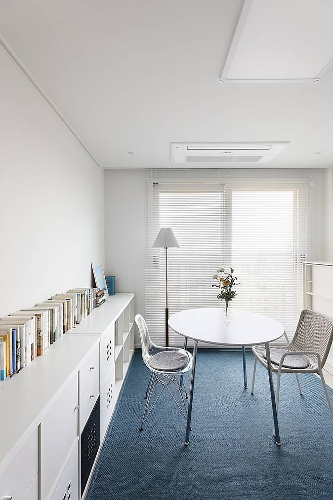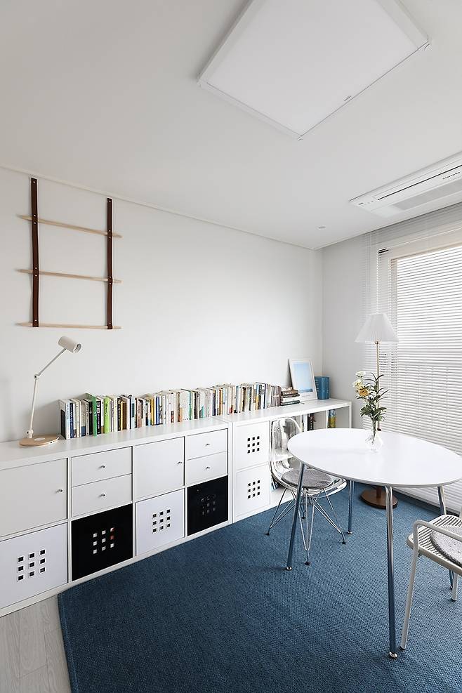 코발트블루 카펫이 인상적인 서재는 업무도 볼수 있고, 독서도 할수 있는 아늑한 공간으로 포인트