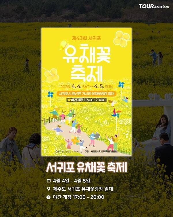 2026 축제는 4월 4일부터 4월 5일까지 서귀포 유채꽃광장 일대에서 진행됩니다. 야간 개장은 17시부터 20시까지 운영됩니다.