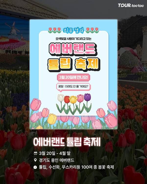 에버랜드 튤립 축제는 국내 대표 봄꽃 테마파크 축제입니다. 다양한 테마 정원과 함께 형형색색 튤립이 가득 펼쳐져 가족 여행지로 인기가 높습니다.
