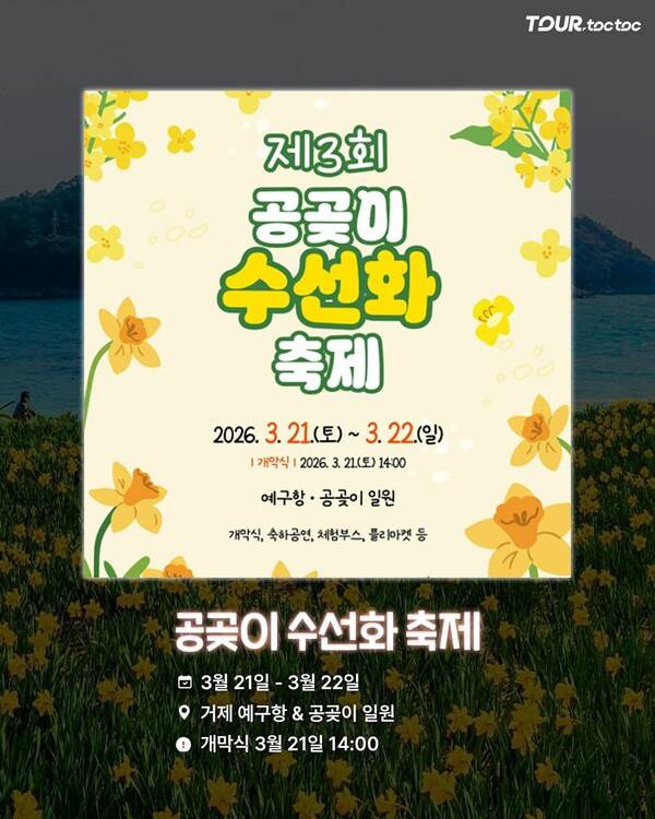 거제 공곶이 수선화 축제는 바다와 함께 수선화 꽃밭을 감상할 수 있는 봄꽃 명소입니다. 바다 전망과 노란 수선화가 어우러진 풍경이 인상적인 장소입니다.