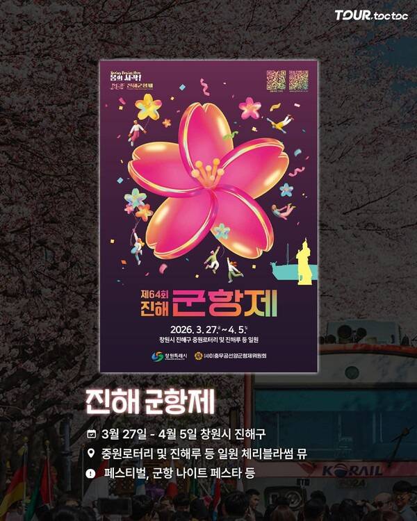 2026 진해 군항제는 3월 27일부터 4월 5일까지 창원시 진해구 중원로터리와 진해루 등 주요 명소에서 진행됩니다. 체리블라썸 뮤직 페스티벌과 군항 나이트 페스타 등 다양한 프로그램이 예정되어 있습니다.