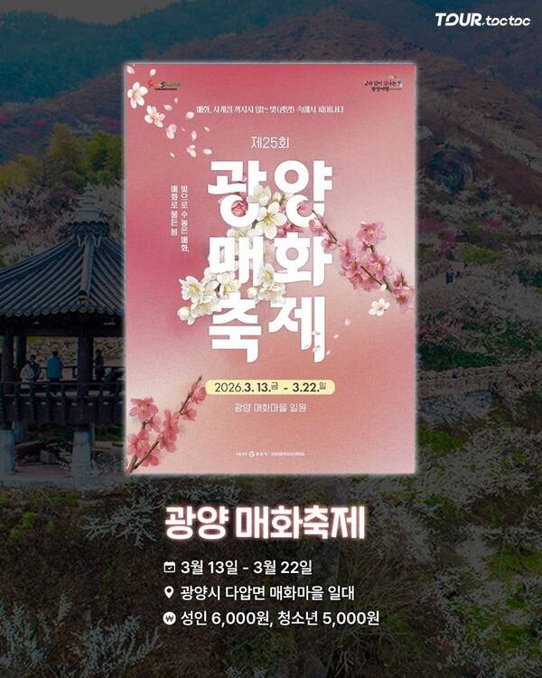 2026 광양 매화 축제는 3월 13일부터 3월 22일까지 광양시 다압면 매화마을 일대에서 열립니다. 입장료는 성인 6,000원, 청소년 5,000원이며 매화 풍경과 함께 다양한 지역 체험 프로그램을 즐길 수 있습니다.