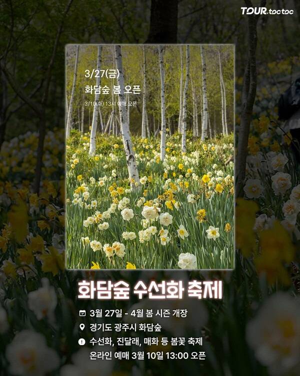2026 봄 시즌은 3월 27일부터 시작되며 경기도 광주시 화담숲에서 진행됩니다. 온라인 예매는 3월 10일 13시에 오픈됩니다.