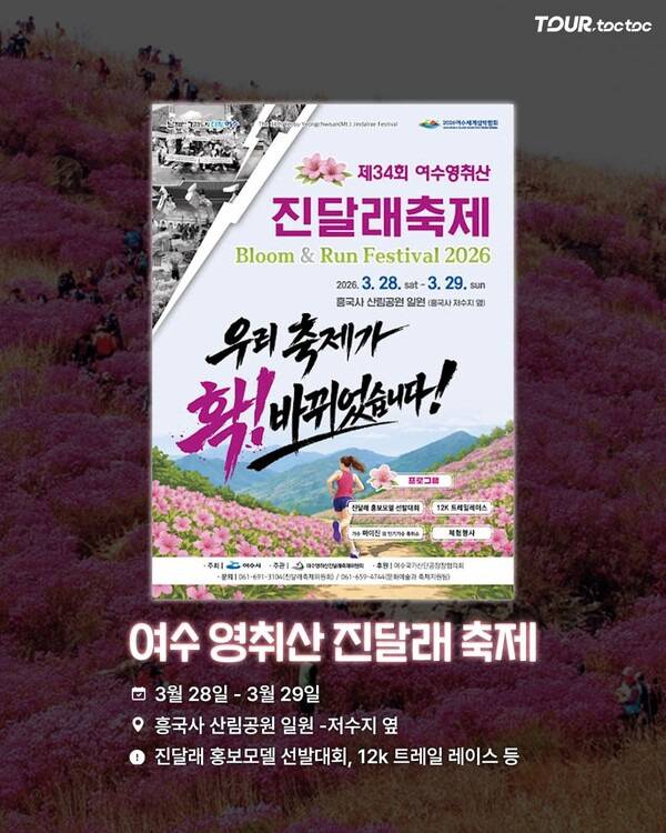 2026 축제는 3월 28일부터 3월 29일까지 흥국사 산림공원 일원에서 개최됩니다. 진달래 홍보모델 선발대회와 12km 트레일 레이스 등 다양한 프로그램이 마련됩니다.