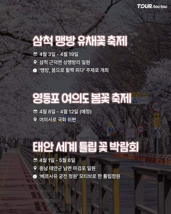 삼척 맹방 유채꽃 축제는 4월 3일부터 4월 19일까지 열리며, 여의도 봄꽃 축제는 4월 8일부터 4월 12일까지 예정되어 있습니다. 태안 세계 튤립 꽃 박람회는 4월 1일부터 5월 6일까지 진행되며 다양한 튤립 정원을 감상할 수 있습니다.