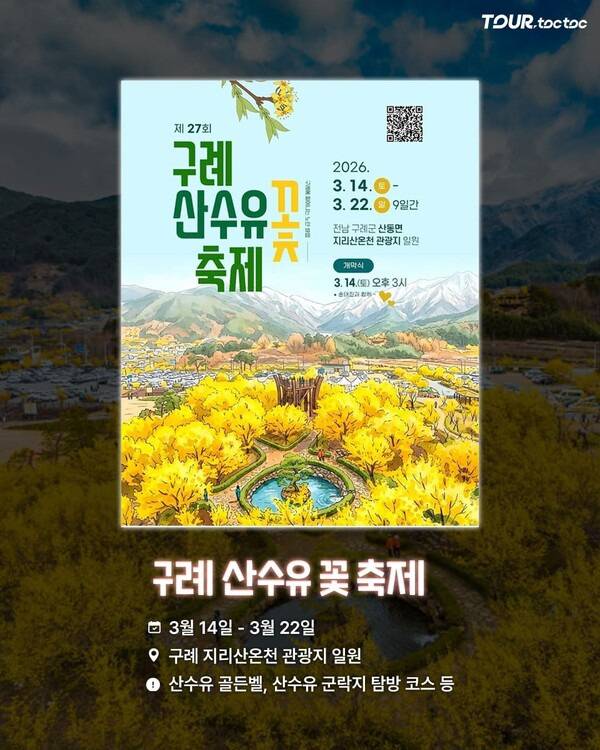 2026 축제는 3월 14일부터 3월 22일까지 구례 지리산온천 관광지 일원에서 개최됩니다. 산수유 골든벨, 산수유 군락지 탐방 코스 등 다양한 체험 프로그램도 함께 진행됩니다.