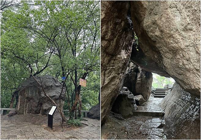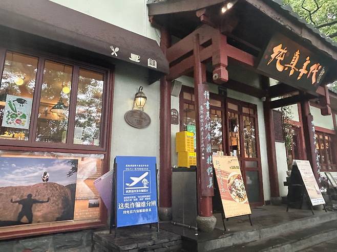 산 속에 자리한 예쁜 건물, 춘전넨따이BookBar(纯真年代书吧)라는 곳으로 책도 읽고 간단한 음식도 먹을 수 있는 공간이다. 투어팀 일행이 BookBar를 지나 조금 더 걷더니 돌문 앞에서 멈춰섰다. 너무 가까이 가면 눈치가 보이니 살짝 떨어진 위치에서 귀를 쫑긋 기울여 봤다.