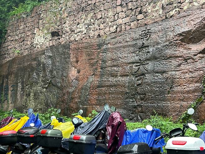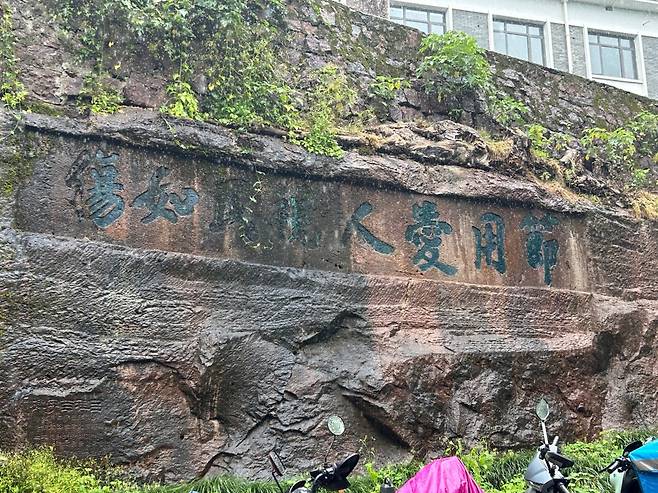 골목길의 벽면은 오토바이들이 주차돼 있는데 그곳에 뭔가 글씨가 적혀 있다. 벽면이 자리한 이 골목길의 이름은 스한루(石函路, 석함로)다. 현재 서호 주변의 주 도로는 베이샨제(北山街)인데, 베이샨제가 건설된 건 불과 100년 전의 일이란다. 지금은 뒷골목으로 밀려난 이 스한루가 새 도로가 나기 전까지 항저우의 첸탕먼(钱塘门)과 서호를 잇는 주요 도로였다 한다. 약 40m에 달하는 골목길의 왼쪽 벽면에 마애 문자 석각이 새겨져 있는 게 이 때문이란다. 이곳의 흔적은 서호 뿐 아니라 중국 전역에서도 드문 것으로, 유교와 불교, 도교가 한데 어우러져 있고, 근현대 중국과 서방 간 교류의 흔적까지 남아 있다 한다. 암벽에 새겨진 글씨 중 ‘南無大日如來’는 1928년 신해혁명 원로인 황원수(黄元秀)가 쓴 것이고, “東南一柱”、“節用愛人,視民如傷”은 명나라 때 반란을 평정한 장가윤이란 인물에게 항저우 사람들이 고마움의 표현으로 새긴 것이라 한다. 이 글자들이 간체자가 아니라 번체자로 쓰여진 이유다. 중국의 간체자는 1956년부터 도입된 것이다.