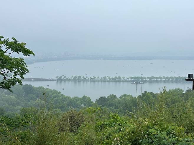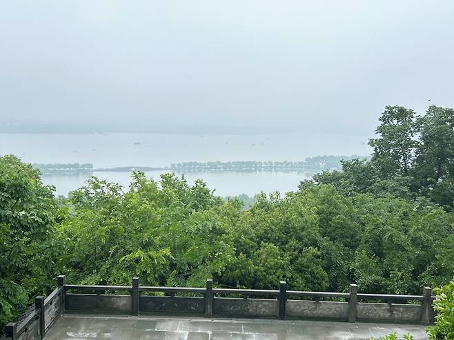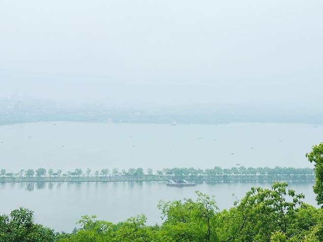정상 바위에 올라서니 서호의 전경이 한 눈에 들어온다. 맑은 날이었다면 더 예뻤겠지만, 흐린 날은 또 흐린 날대로 운치가 있다. 왼편으로 보이는 우뚝 솟은 탑이 바오추탑(保俶塔)이다. 가까워 보여 일하는 분께 여기서 바오추탑까지 갈 수 있냐 물으니 맑은 날이면 바위를 타고 넘어갈 수 있지만, 비가 오니 미끄러워서 위험하단다. 다른 길로 갈 수 있으니 그리고 가라고 알려준다.