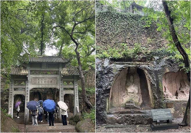 이어서 이동한 곳은 대불사 유적이다. 대불사는 오대 후주 현덕 2년(955년)에 세워진 사찰인데, 당시에는 대불이 없었기에 ‘도솔사’라 불렀다 한다. 대불이 만들어진 건 북송 말기로, 불상을 만들었다기보다는 불상처럼 보이는 거대한 바위가 자리하고 있다. 지금은 남아있는 게 거의 없어 내용을 알고 방문하지 않으면 대불이 있는지조차 알 수가 없다. 이 바위는 기원전 220년에는 진시황이 남쪽 지방을 순유할 때 배를 댔던 곳이라 한다. 당시 항저우는 광활한 바다였고, 진시황이 보석산 앞에 도착했을 때는 풍랑을 만나 배를 돌리기 어려워 배의 밧줄을 대불인 거대한 바위에 묶어 안전하게 배를 정박시킬 수 있었다고 전해진단다. 갑자기 빗줄기가 거세지는 바람에 주변을 제대로 둘러보지는 못했다.