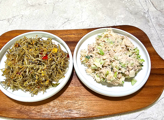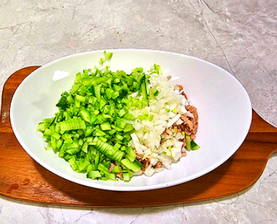 🔪 2. 양파는 작게 다져주고, 오이는 껍질 부분만 돌려 깎아 잘게 썰어줍니다. 🥣 3. 물기를 제거한 참치에 다진 양파, 오이를 넣고 마요네즈를 적당량 넣어 잘 섞어줍니다.